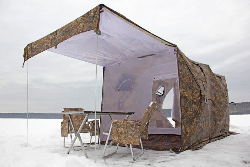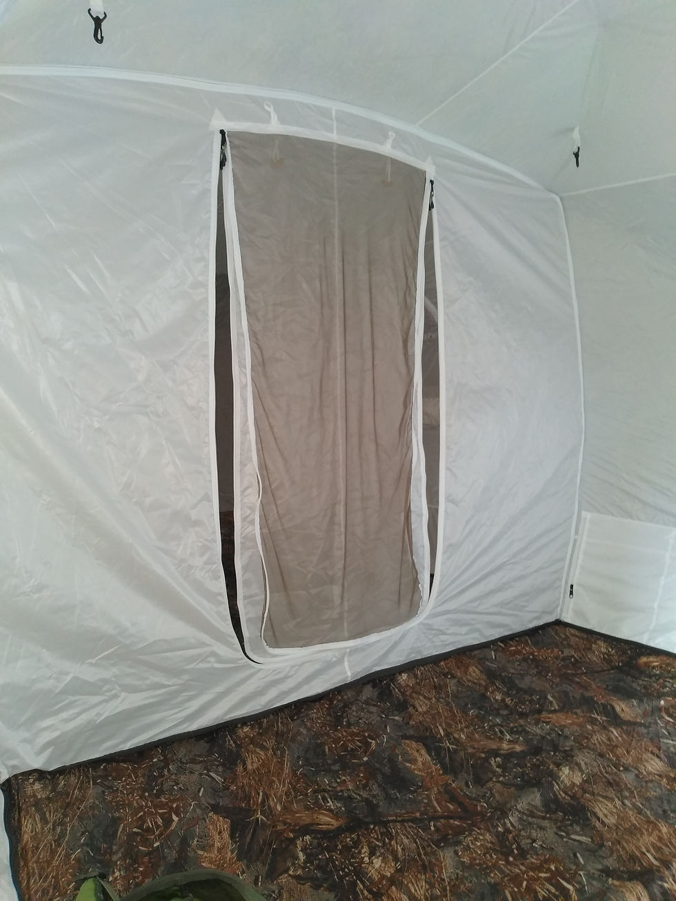 - Откидная торцевая стенка. С помощью этой функции кемпинг в теплое время года становится более комфортным. Стенка послужит навесом для оптимизации пространства перед палаткой: под навесом можно организовать обеденную зону. Для установки навеса в комплекте с палаткой предназначены опорные стойки из прутка В95Т1.Внутренний тент с перегородкой из ткани Оксфорд и дном на молнии. Перегородка крепится при помощи молнии и делит палатку на два помещения. В одном можно организовать жилой модуль с установкой туристических раскладушек, а в другом хранить снаряжение и вещи. Внутренний тент дублирует основную палатку, оборудован герметичным дном на молнии, карманами на стенках и карабинами для подвешивания вещей или фонарика.О НЕОБХОДИМОСТИ И РАЗНИЦЕ ВНУТРЕННИХ ТЕНТОВ: Во время использования Куба для зимней рыбалки (при обогреве печами длительного горения), между слоями внутреннего и внешнего тента образуется "конденсат". Это влага, которая является естественным следствием разницы температур внутри и снаружи палатки.